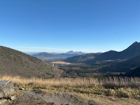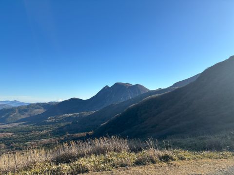 見えているのは三俣山(左)と星生山(右端)。間にある硫黄山から、火山活動が穏やかなのか、この日は噴煙が出ていない。