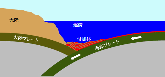 付加体(ふかたい)とは、海洋プレートが海溝で大陸プレートの下に沈み込む際に、海洋プレートの上の堆積物がはぎ取られ、陸側に付加したもの。